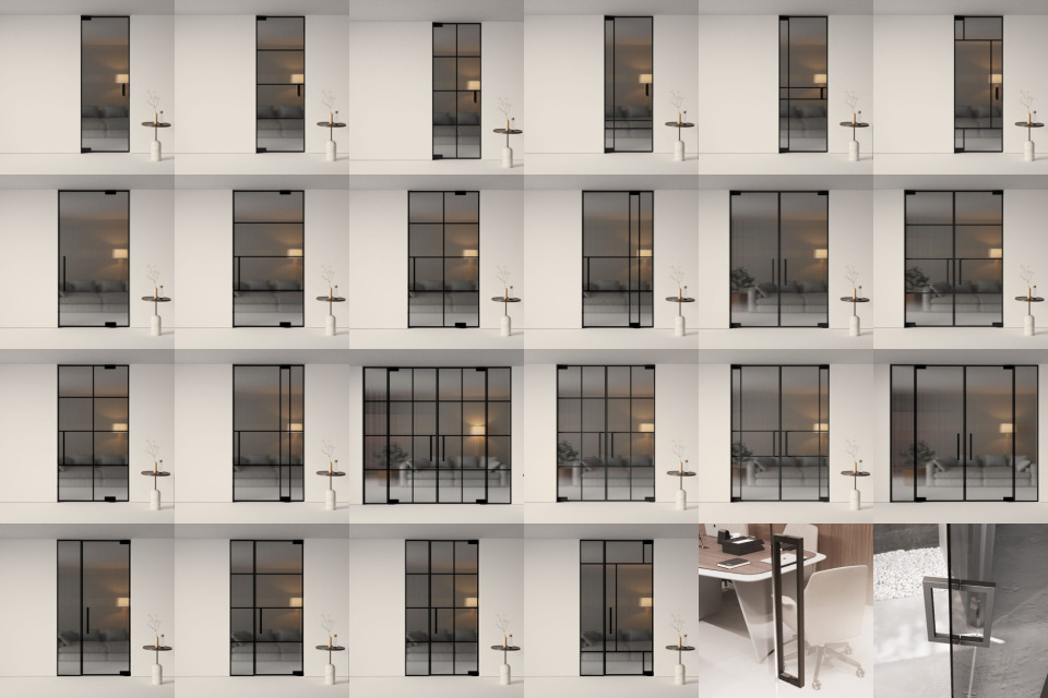 Przy zabudowach szklanych dokładna konfiguracja z której strony drzwi, podział tafli do ustalenia. Wszystko pod wymiar klienta.