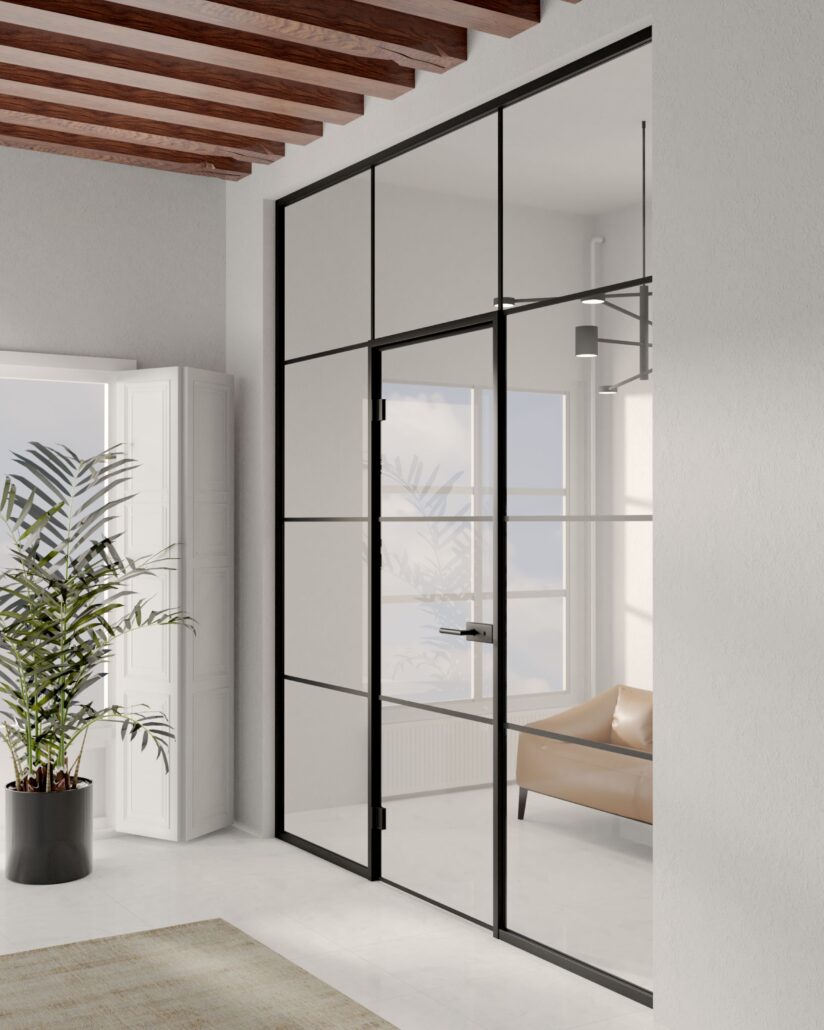 Zabudowa szklana - drzwi w ościeżnicy - czarne szprosy