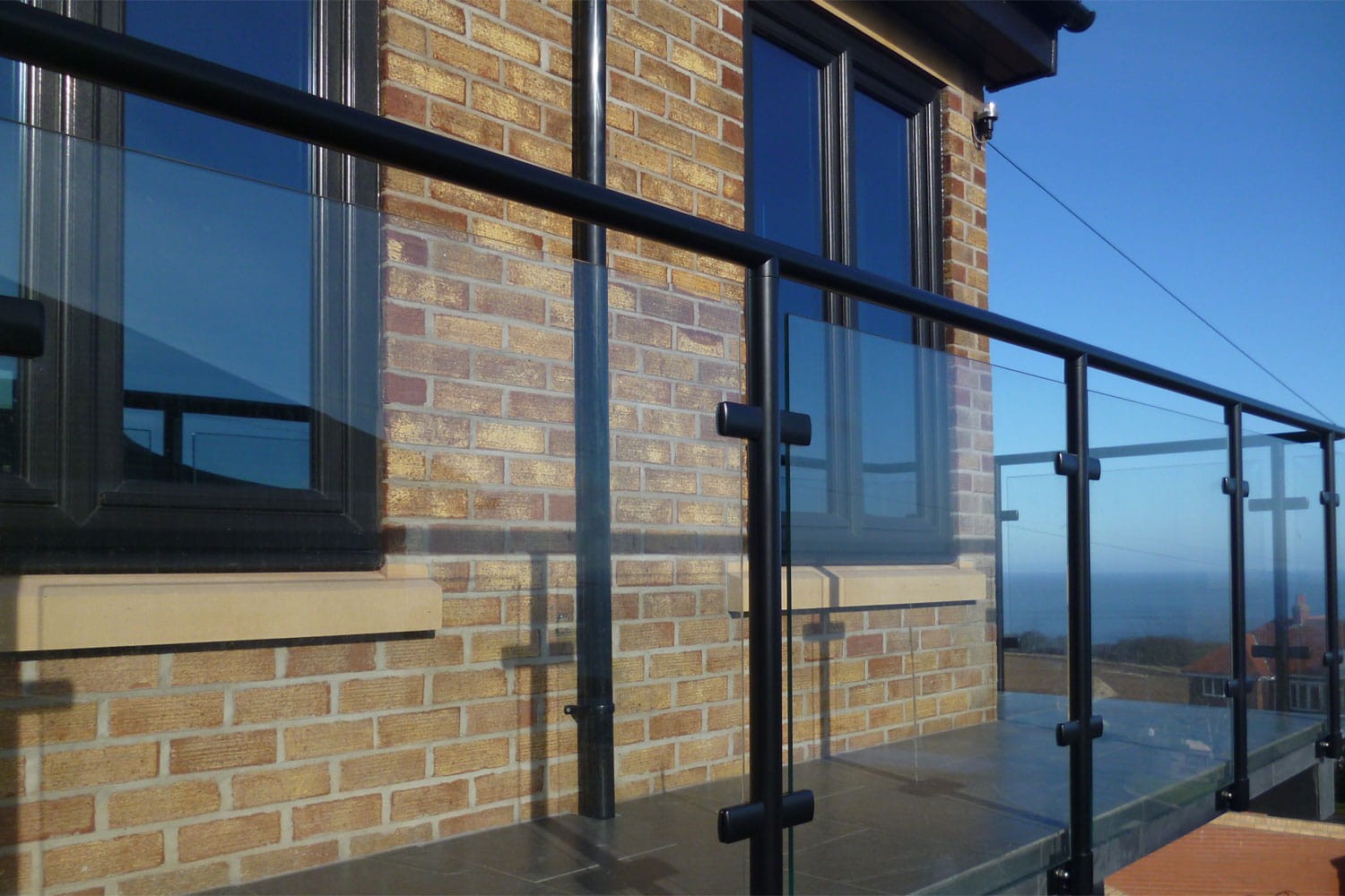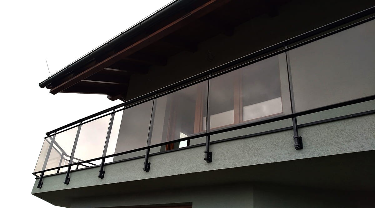Balustrada z poręczą lakierowana RAL 9005, słupki ze szkłem w listwach poziomych, mocowanie do boku