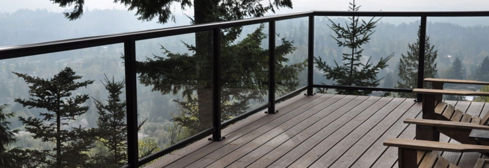 Balustrada z poręczą lakierowana RAL 9005, słupki ze szkłem w listwach poziomych, mocowanie na wierzch