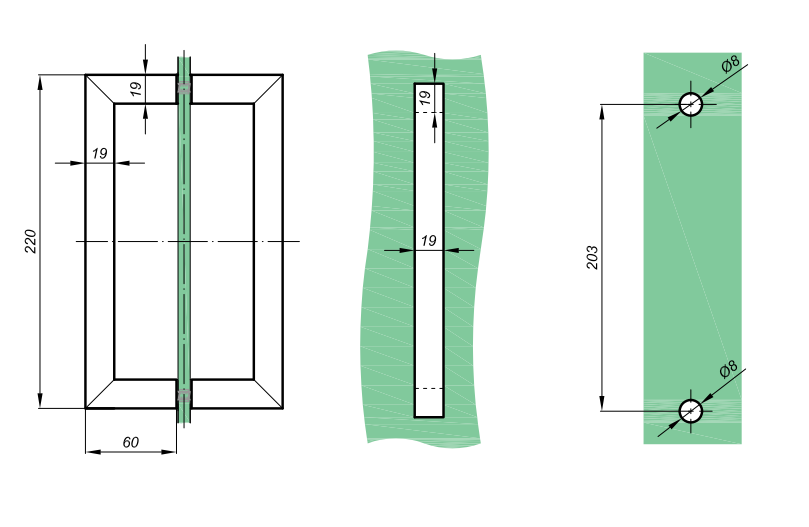 Średnica otworów w szkle: 8mm, materiał: stal nierdzewna, długość całkowita: 220mm, przekrój pochwytu 19x19mm
