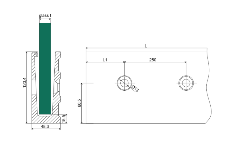 Materiał: Aluminium, Wykończenie powierzchni: satynowe aluminium, szkło grubości: 12,00-21,52 mm, długość 250 cm