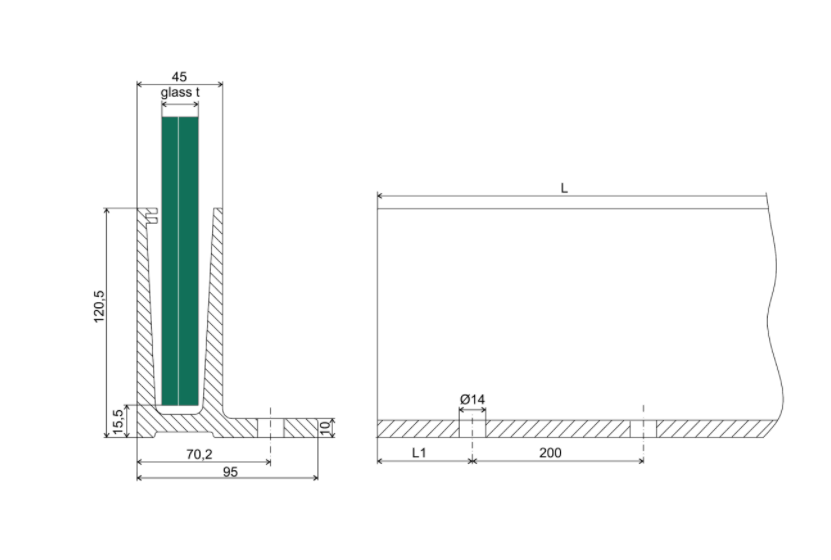Materiał: Aluminium, Wykończenie powierzchni: satynowe aluminium, szkło grubości: 12,00-21,52 mm, długość 250 cm